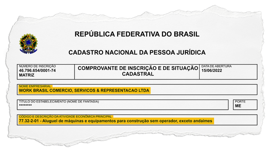 Quando foi aberta, em junho de 2022, a Work Brasil Serviços Comércio e Representação tinha a “fabricação de artefatos de cimento para uso na construção” como atividade econômica principal, mas isso não impediu que a empresa fosse contratada em 2023 pela Prefeitura de Seropédica para fornecer kits de lanches para atender camarins de artistas que por lá fossem se apresentar.
