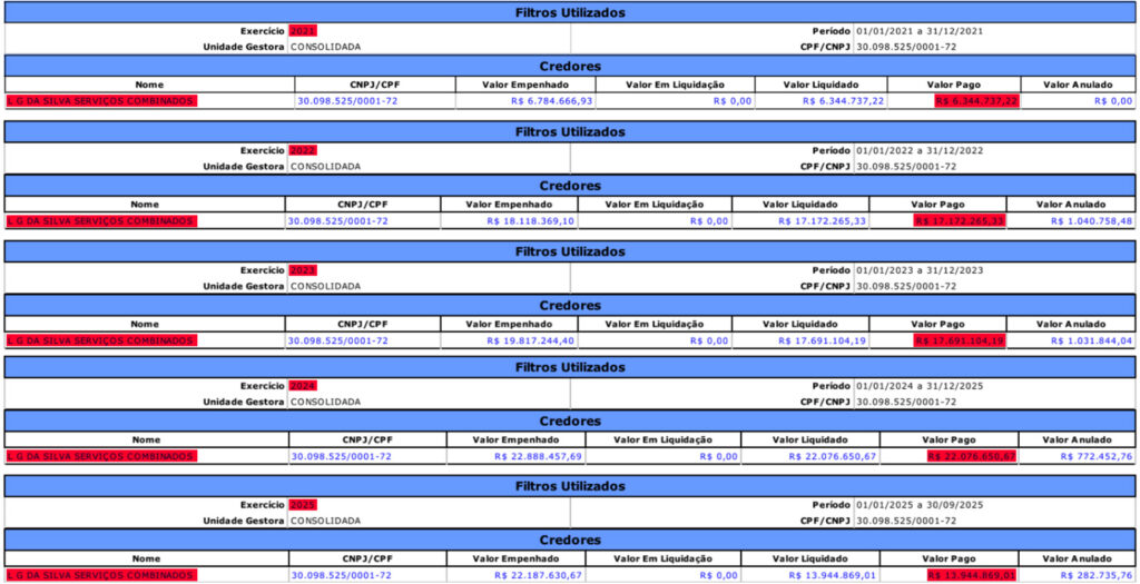 No ano passado, aponta o sistema, os pagamentos chegaram a R$ 22.076.650,67, e foram pagos à empresa R$ 17.691.104,19 em 2023, R$ 17.172.265,33 em 2022 e R$ 6.344.737,22 em 2021.