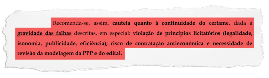 “Recomenda-se, assim, cautela quanto à continuidade do certame, dada a gravidade das falhas descritas, em especial: violação de princípios licitatórios (legalidade, isonomia, publicidade, eficiência); risco de contratação antieconômica e necessidade de revisão da modelagem da PPP (parceria público privada) e do edital”.