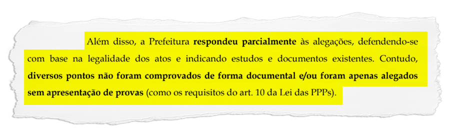 A manifestação da representante do Ministério Público de Contas, no entanto, não valeu de nada, pois mesmo tendo a procuradora citado que a Prefeitura respondeu apenas parcialmente às alegações contidas na representação que apontou irregularidades no edital, e dito que “diversos pontos não foram comprovados de forma documental e/ou foram apenas alegados sem apresentação de provas”, o que a levou recomendar a “concessão de tutela provisória para suspender o certame até análise definitiva”, o processo continuou e foi firmado um contrato de mais de R$ 1,5 bilhão.