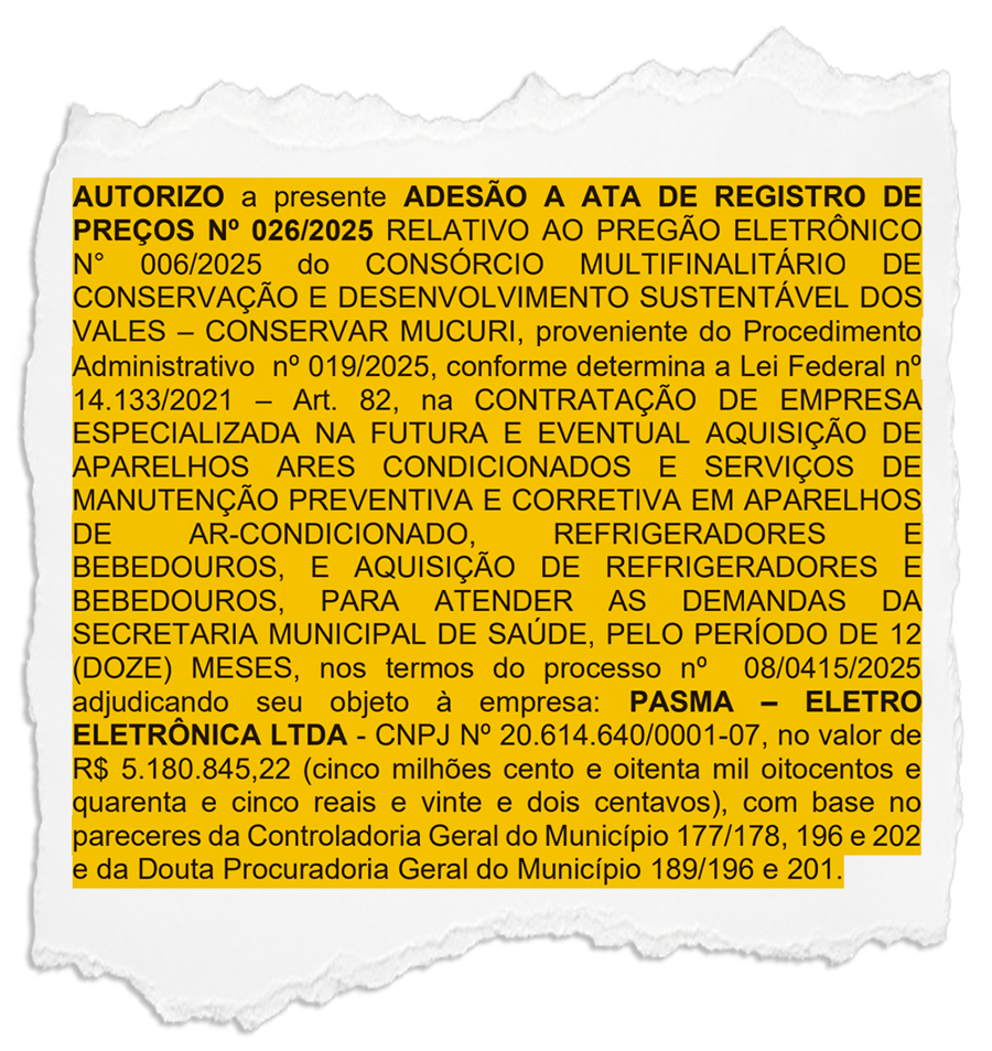 O ato de adesão pela Secretaria de Saúde data de 4 de novembro e foi assinado assinado pelo secretário Eduardo Macedo Feital, e pela presidente da Fundação Municipal de Saúde, Andressa de Freitas Barros. De acordo com o documento, o objeto contratado é aquisição de “aparelhos ares-condicionados e serviços de manutenção preventiva e corretiva em aparelhos de ar-condicionado, refrigeradores e bebedouros, e aquisição de refrigeradores e bebedouros, para atender as demandas da Secretaria Municipal de Saúde pelo período de 12 meses”.