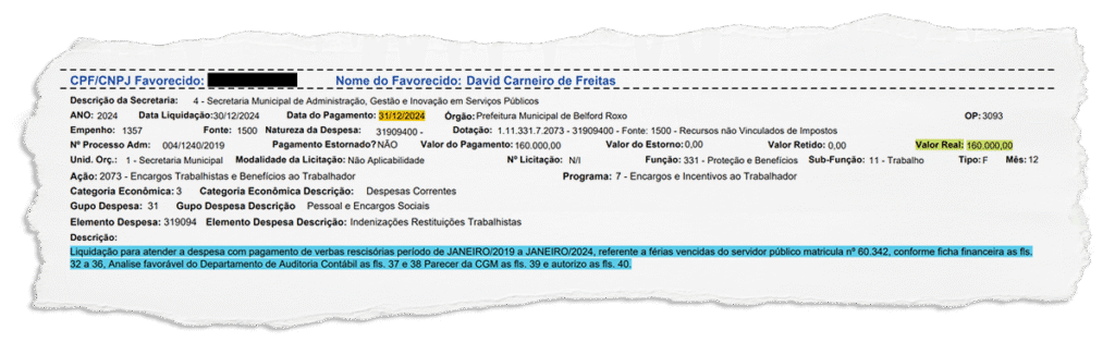 De acordo com o documento, a quitação dos valores devidos ao hoje responsável pelo RH de Meriti, foi garantida por meio do empenho 1357 e justificada como “despesa com pagamento de verbas rescisórias período de janeiro”. Ainda pelo que está no documento, o valor que aparece como liquidado é de R$ 160 mil, não teria ocorrido nenhum estorno ou retenção, registrando como valor real pago efetivamente o mesmo total.