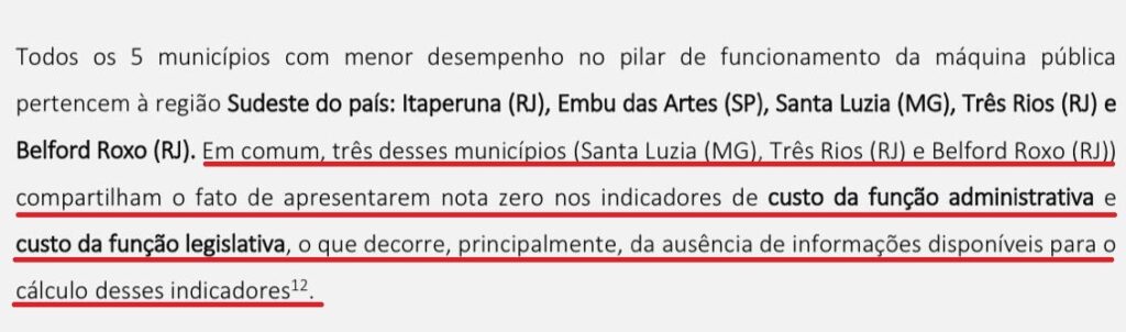 De acordo com o estudo, Belford Roxo divide com Itaperuna, Três Rios, Embu das Artes (SP), e Santa Luzia (MG), “o menor desempenho no funcionamento da máquina pública”, tendo recebido, junto com o município de Santa Luzia, “nota zero nos indicadores de custo da função administrativa e custo da função legislativa”.
