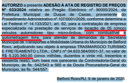 Mal 2026 começou a ata 033 foi aderida mais uma vez em Belford Roxo pela mesma secretaria. Com valor de R$ 5.220.360,00, a adesão tem como objeto o aluguel de cinco micro-ônibus “com combustível e quilometragem livre”.
