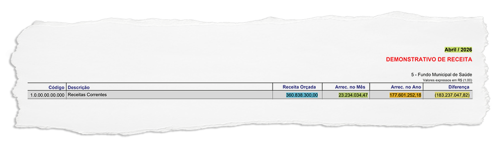 Mais dinheiro – Conforme revelam documentos oficiais, a previsão orçamentária do Fundo Municipal de Saúde para o exercício de 2026 é de R$ 360,8 milhões, R$ 130 milhões a mais que no ano passado, quando o orçamento do FMS foi de R$ 230,5 milhões. Para se ter uma ideia, só nos primeiros 15 dias deste mês a receita do Fundo foi de R$ 23,2 milhões, enquanto em todo o mês de abril de 2025 o FMS registrou uma entrada de R$ 20,3 milhões.