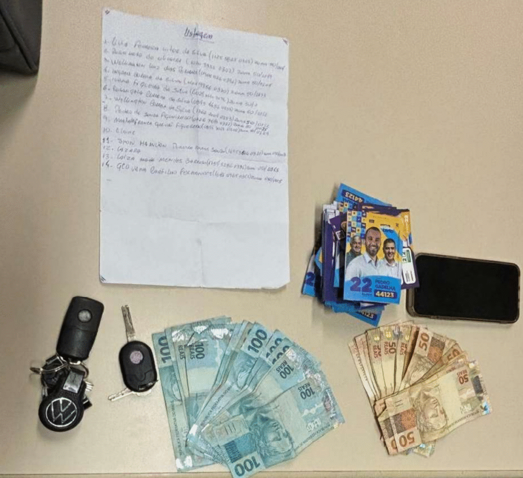 O material usado para sustentar a ação foi apreendido com o cabo eleitoral Glauco Pereira da Penha, que na época era assessor parlamentar de Pedro Gadelha. No baú da moto de Glauco foram encontratos R$ 2.400,00, uma lista com nomes com números de títulos de eleitores e santinhos com os nomes e números dos candidatos a vereador Pedro Gadelha, 44.123, prefeito Ramon Gidalte e Vice Marcos Frése Miller.