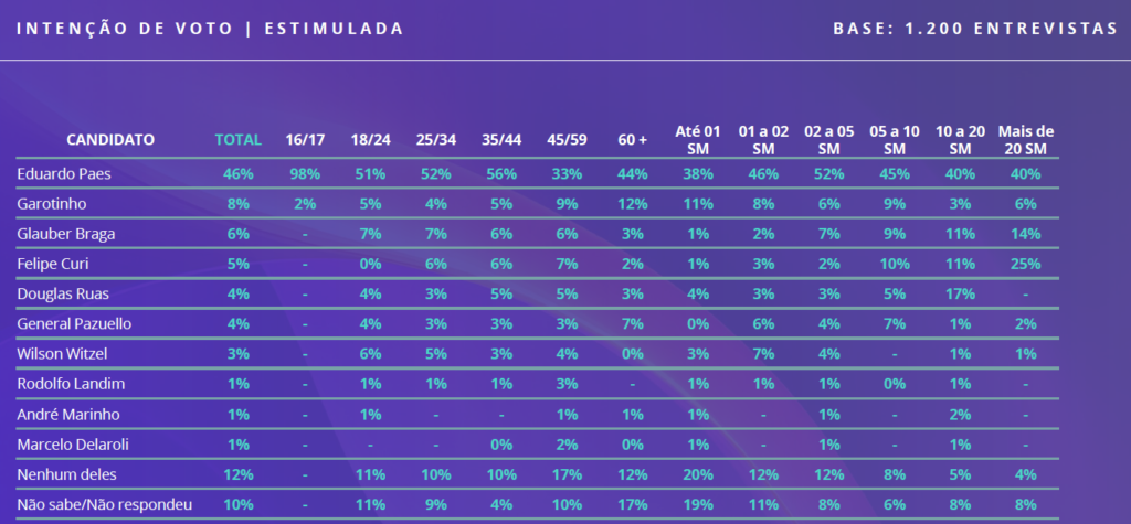 De acordo com os números, o ex-governador Anthony Garotinho é o segundo colocado, com 8%, seguido de Glauber Braga (6%), Felipe Curi (5%), Douglas Ruas (4%), General Pazuello (4%) e Wilson Witzel ( 3%). Alguns nomes surgem com 1% cada, e outros nem pontuaram.
