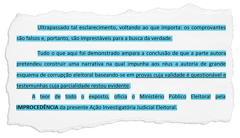 Para concluir pela improcedência a promotora ouviu seis testemunhas e analisou documentos, e cita em sua manifestação que “não pode desconsiderar que os comprovantes de votação acostados aos autos, como ‘prova’ de que teria havido compra de votos por parte dos réus, são comprovadamente falsos, conforme certidão do cartório da 54ª ZE”.