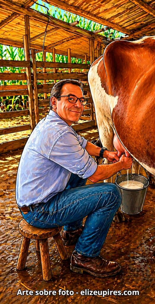 Depois de montar a cavalo, Paes experimenta a ordenha